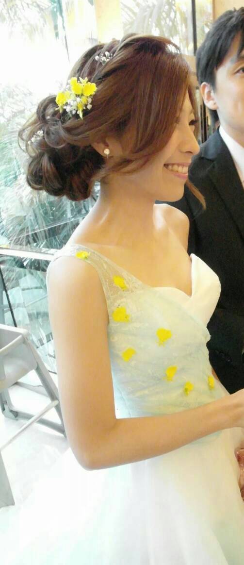 第四個:送客時造型,頭髮鬆鬆的很好看,線條感也很浪漫,頭髮及禮服上都加了鮮花,使得造型更整體。